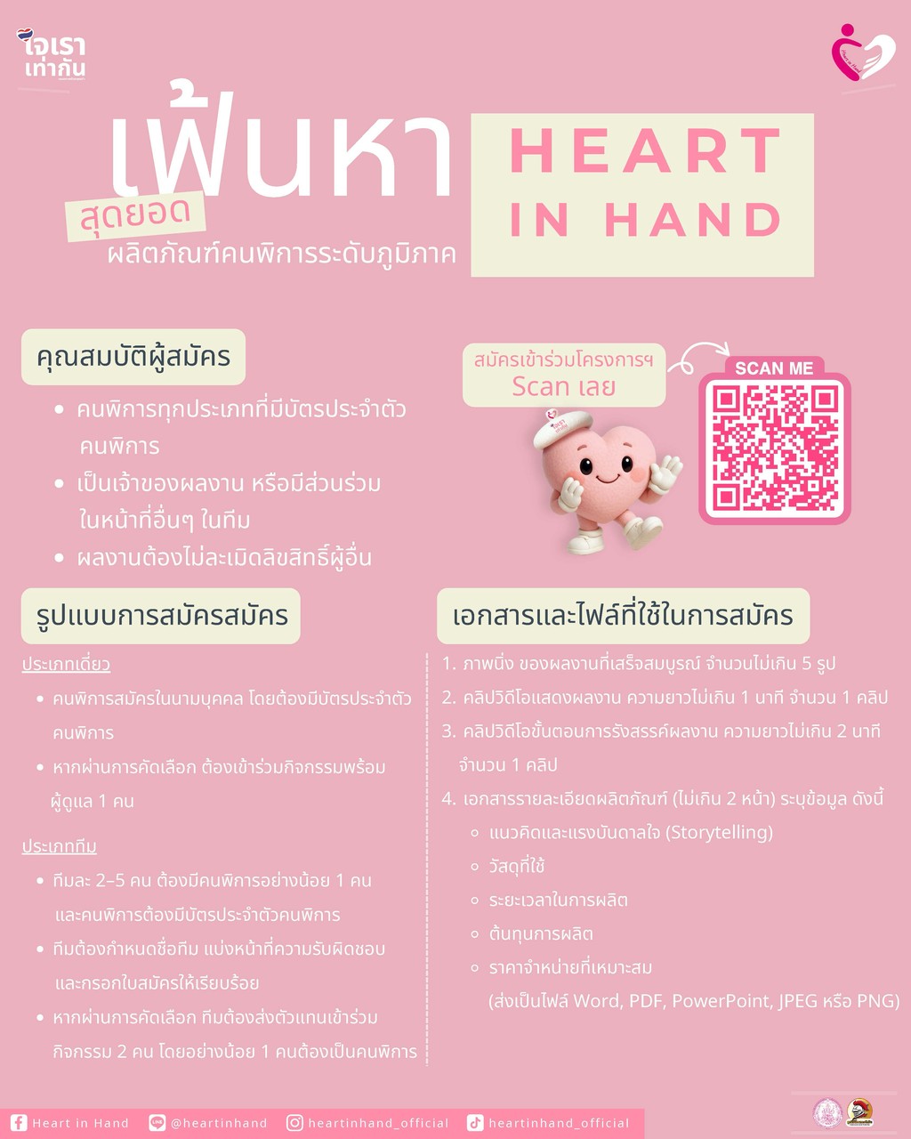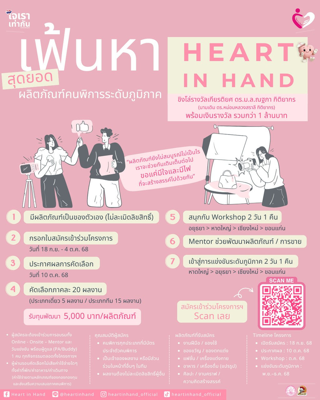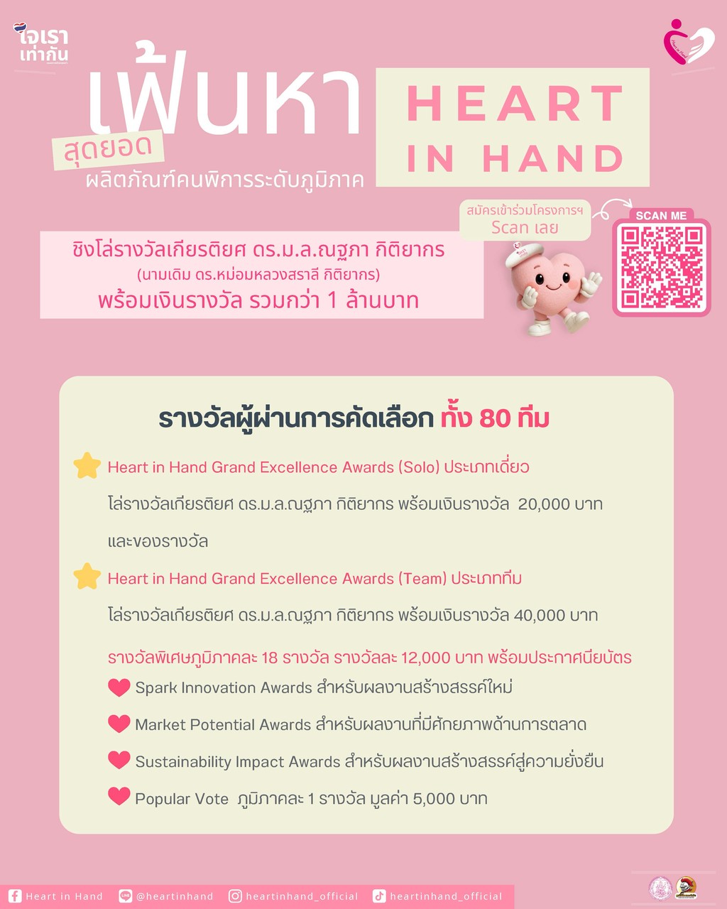 โครงการ “ใจเราเท่ากัน” เสมอภาคด้วยคุณค่า เฟ้นหาสุดยอดผลิตภัณฑ์คนพิการ Heart in Hand ระดับภูมิภาค ชิงโล่รางวัลเกียรติยศ ดร.ม.ล.ณฐภา กิติยากร (นามเดิม ดร.หม่อมหลวงสราลี กิติยากร) พร้อมเงินรางวัลมูลค่ารวมกว่า 1 ล้านบาท